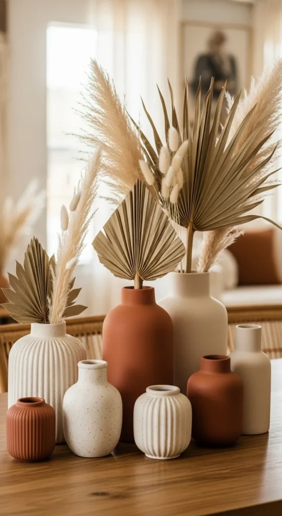 Dried palms and pampas grass add height and texture. They last long and don’t need maintenance. Place them in ceramic or clay vases. Use different heights to create visual interest.