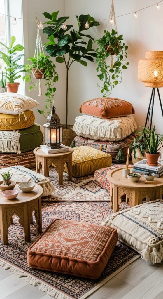 Floor cushions give a cozy, informal vibe. Layer two or three in different textures. Great for movie nights or small gatherings. You can even repurpose old cushions by sewing covers from thrifted fabrics.