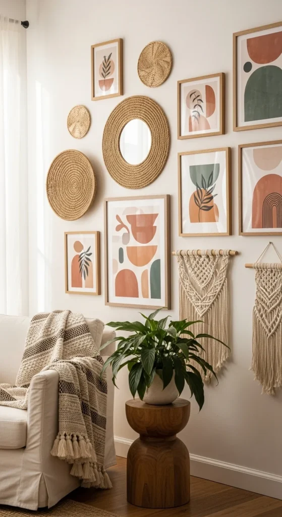 Gallery walls work beautifully in boho spaces. Mix framed art with woven baskets, macramé, or mirrors. Start by arranging items on the floor first. Stick to earthy colors to keep everything cohesive.