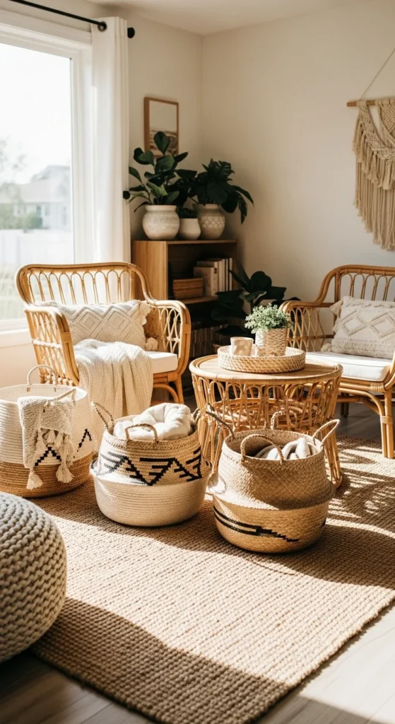 Rattan has its moment again. A single rattan chair instantly softens modern spaces. If new furniture feels pricey, try secondhand stores where rattan pieces are easy to find. Add a cushion in linen or cotton for comfort. Mix rattan with jute or macramé for extra texture.
