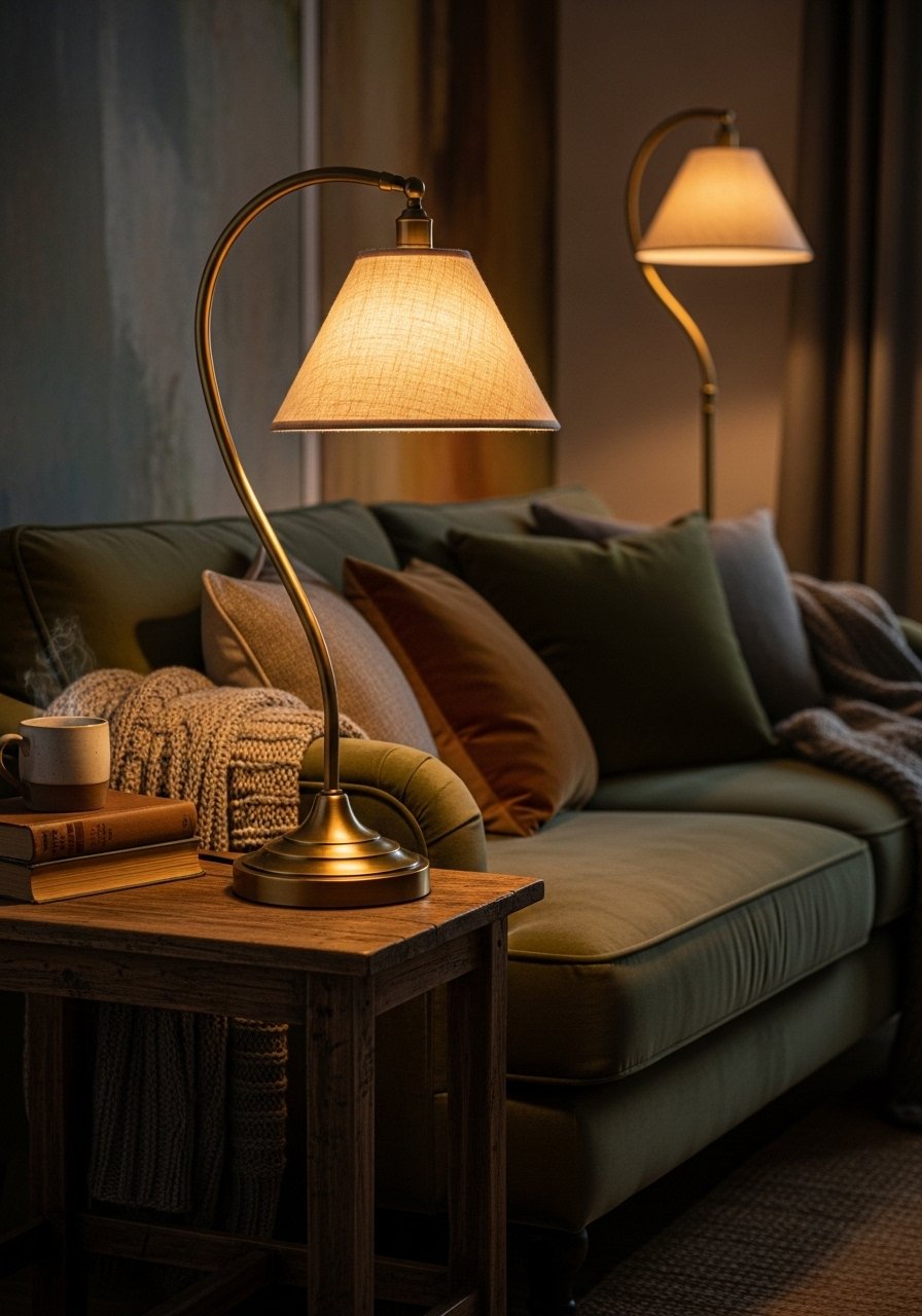 Use a soft white bulb (2700K) and a fabric shade that diffuses light. The lamp becomes both a practical task light and a tactile detail that ages well.