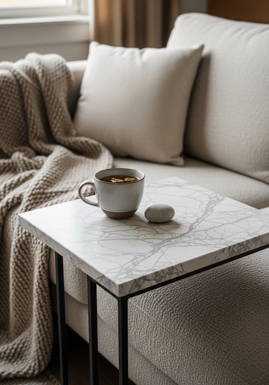 My mistake was choosing overly glossy stone that read cold. A honed finish with visible veins felt more natural. Even a small slab as a tray or table is enough to matter.