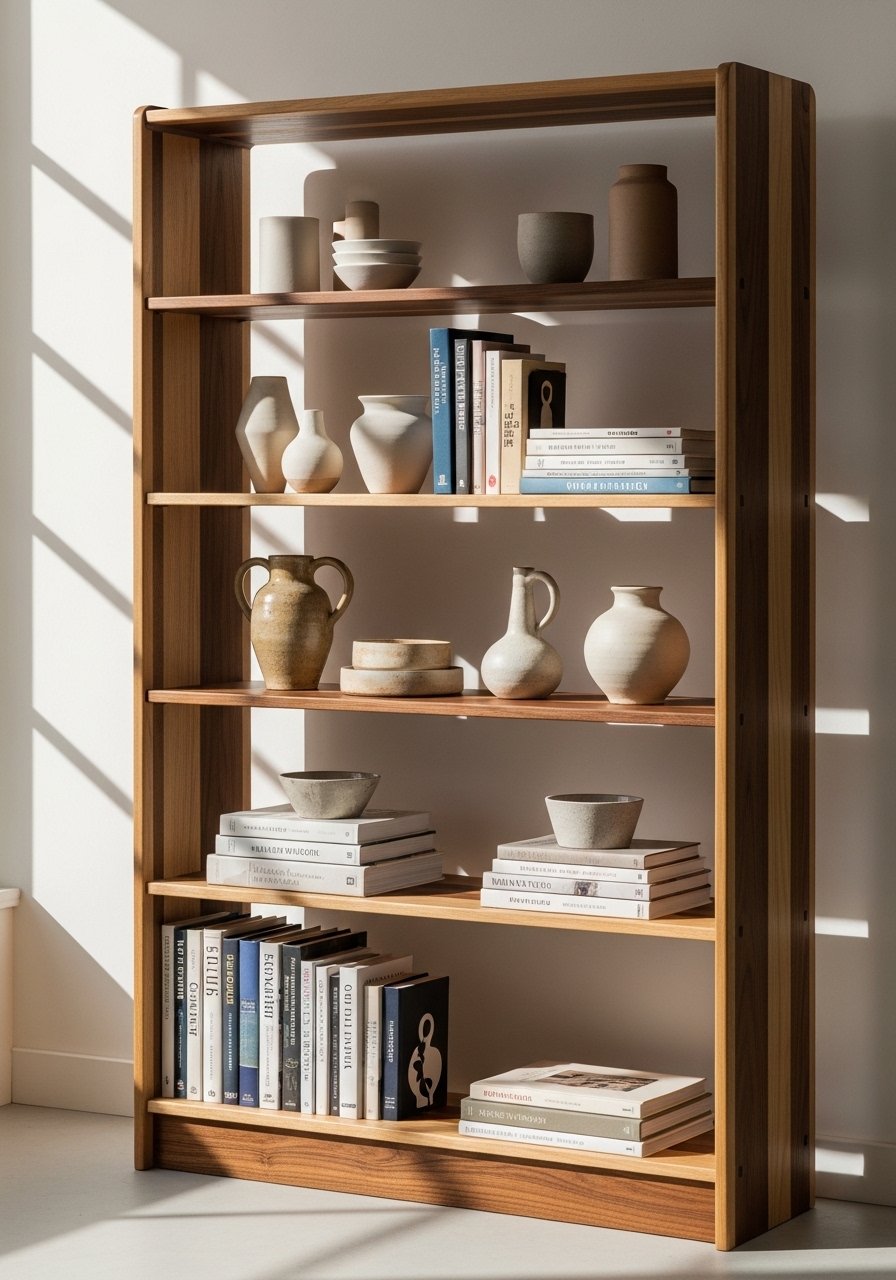 Use ceramics, small plants, and a couple of framed photos. The mix of materials keeps the shelf tactile and grounded.