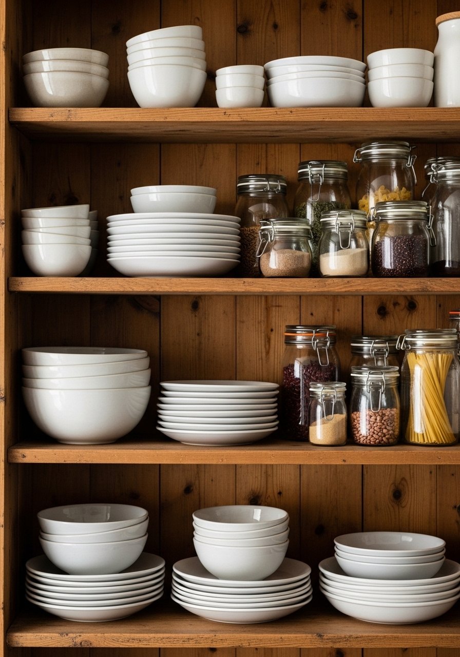 18. Open Shelves with Mixed Ceramics for Everyday Use
