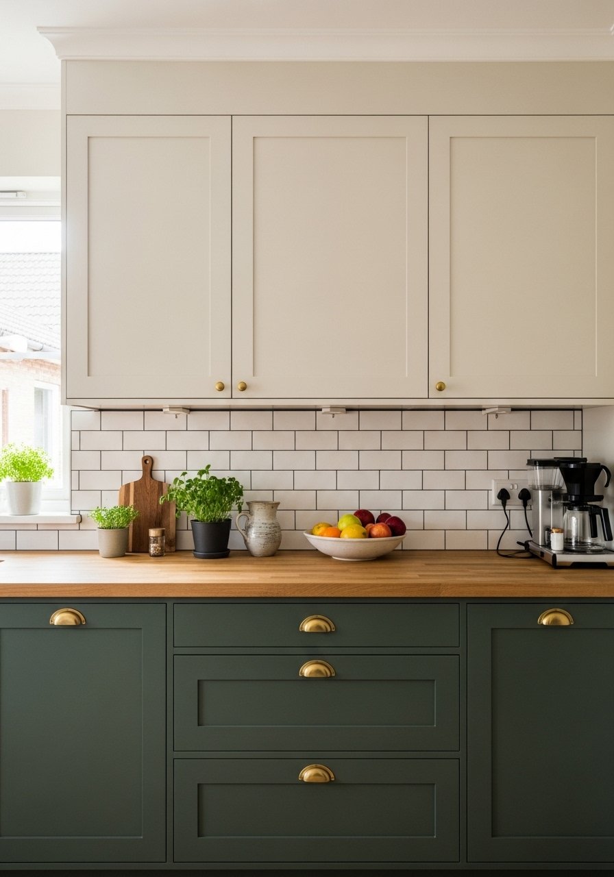 I painted lower kitchen cabinets a deep olive and left the walls light. The room gained depth while staying bright — the darker low pulls visual weight down where it belongs.