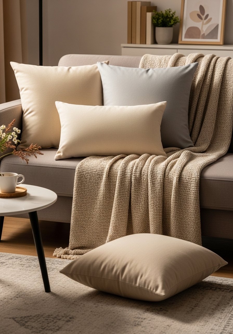 I draped three different neutral textiles across my sofa and the room suddenly read as intentional, not empty. I mixed cream linen, camel wool, and a jute lumbar. It added depth without clutter.