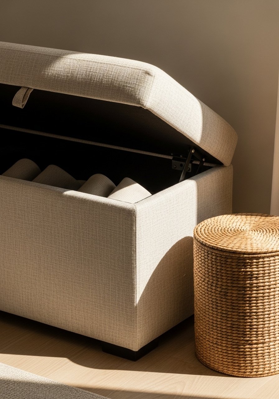 Store off-season items in a slim box under the bench. Rotate small, affordable pieces that pack away flat.