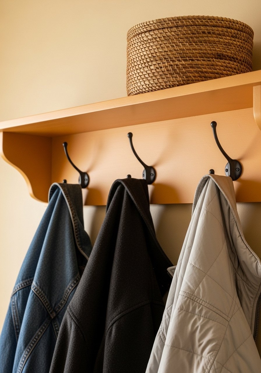 I installed a simple shelf with hooks after coats piled awkwardly on a chair. It’s basic, but it suddenly felt like an entry used by people, not a display.