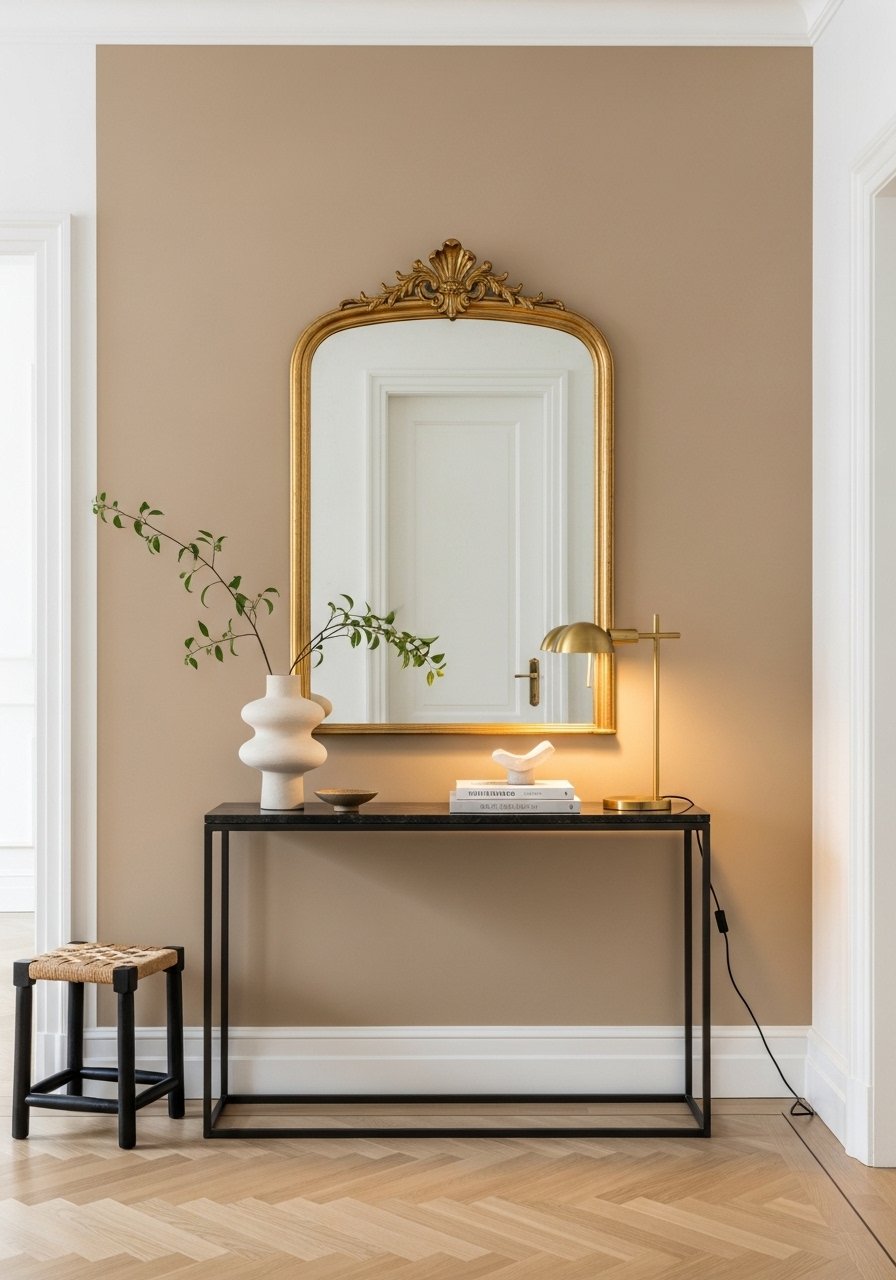 I painted the wall behind the console a warm neutral to ground the space. White walls felt sterile; this single wall made everything sit together.