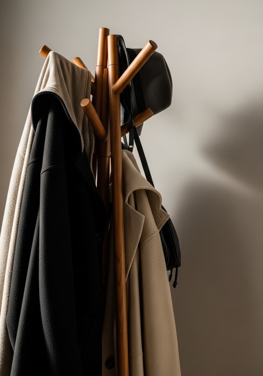Place it away from the door swing so coats don’t brush the threshold. Choose wood or metal that harmonizes with other finishes.
