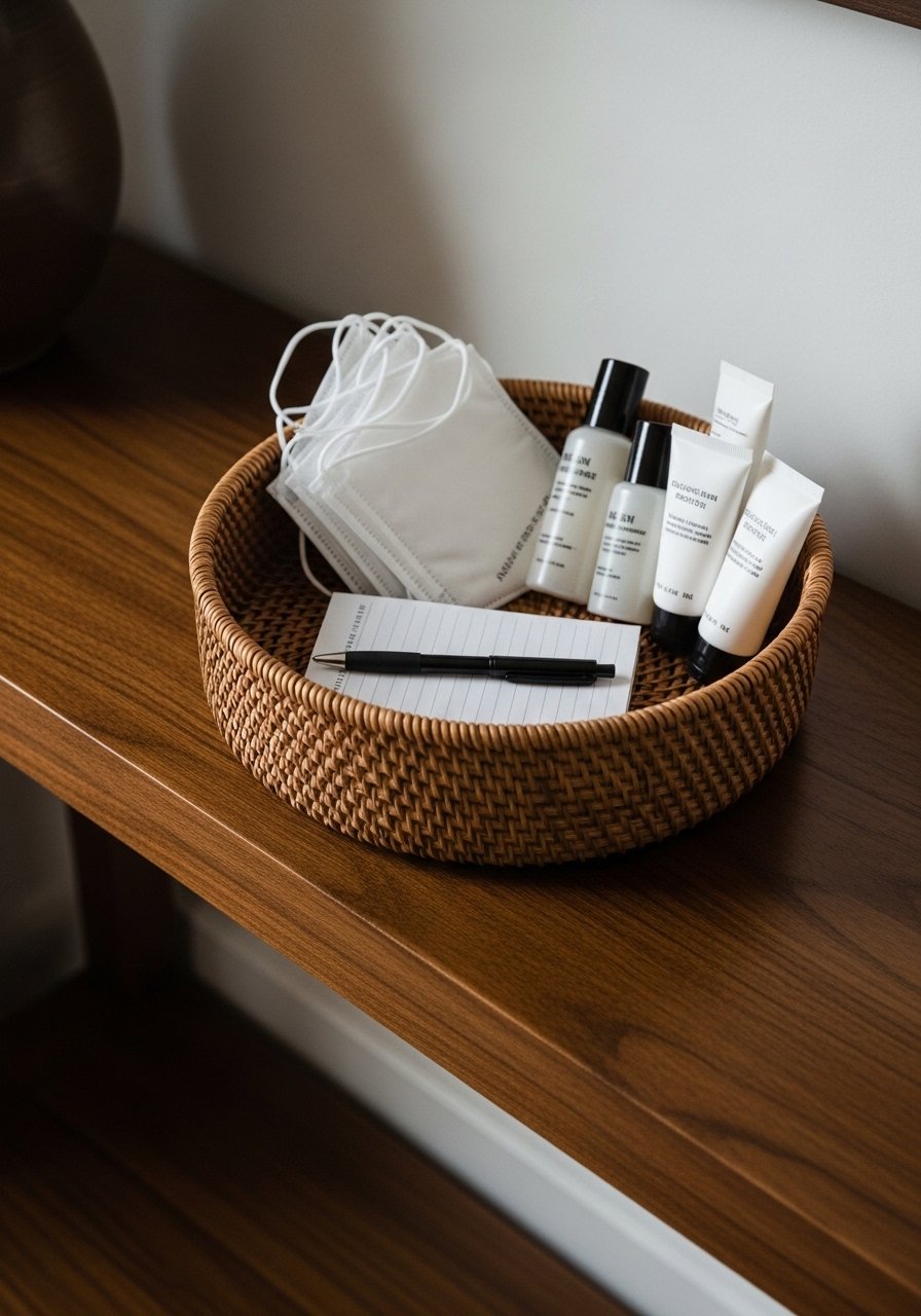 I keep a small welcome basket for guests with basics like lip balm and spare masks. It’s low-effort hospitality that doesn’t scream “decor.”