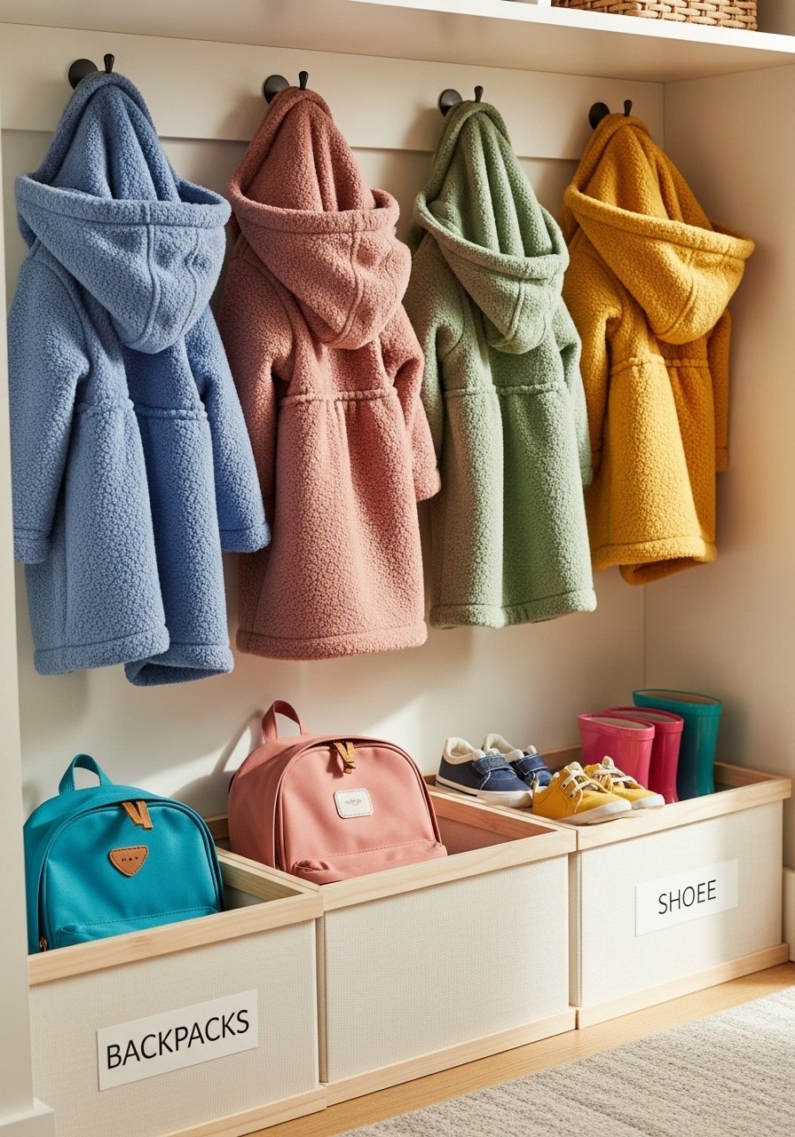 Low hooks and labeled bins give kids ownership. I’d put hooks too high at first — frustrating for everyone — so I lowered them.