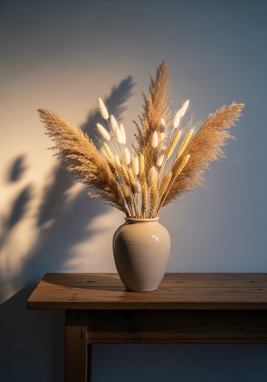I replaced summer greens with dried stems and pampas for an autumnal look that lasts. This dried pampas grass bundle adds height and texture without watering. Mistake: overfilling a small vase — keep stems airy. Dried botanicals are a fresh angle many miss; they read seasonal without the decay of fresh flowers and add sculptural interest to simple vases.