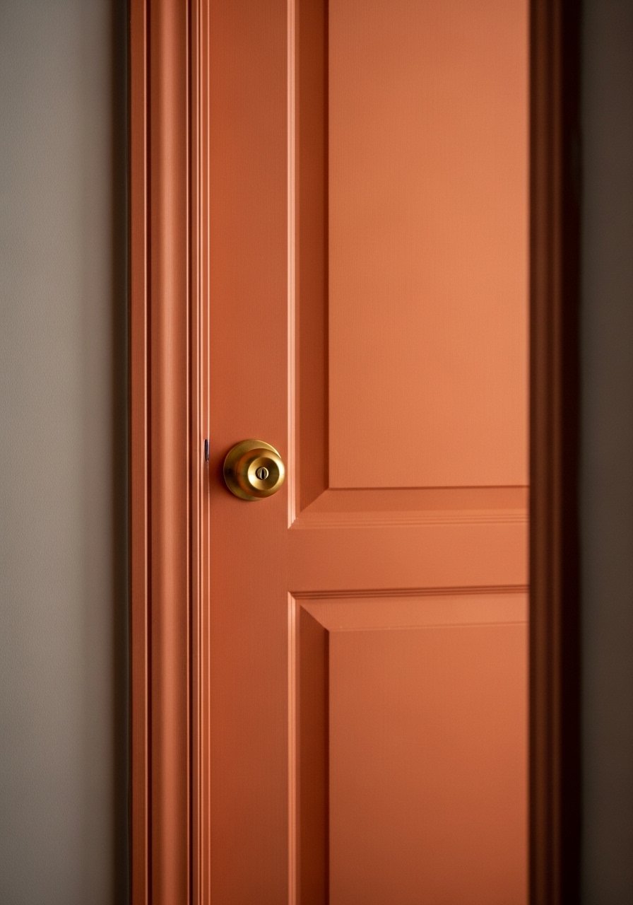 I painted an interior door a warm terracotta to add subtle fall color without a full repaint. A little paint goes a long way. This terracotta sample can be tested on the door first. Mistake: painting everything at once. Start with a single door or trim piece to test the vibe. Accent paint gives color and warmth while keeping the main palette neutral.