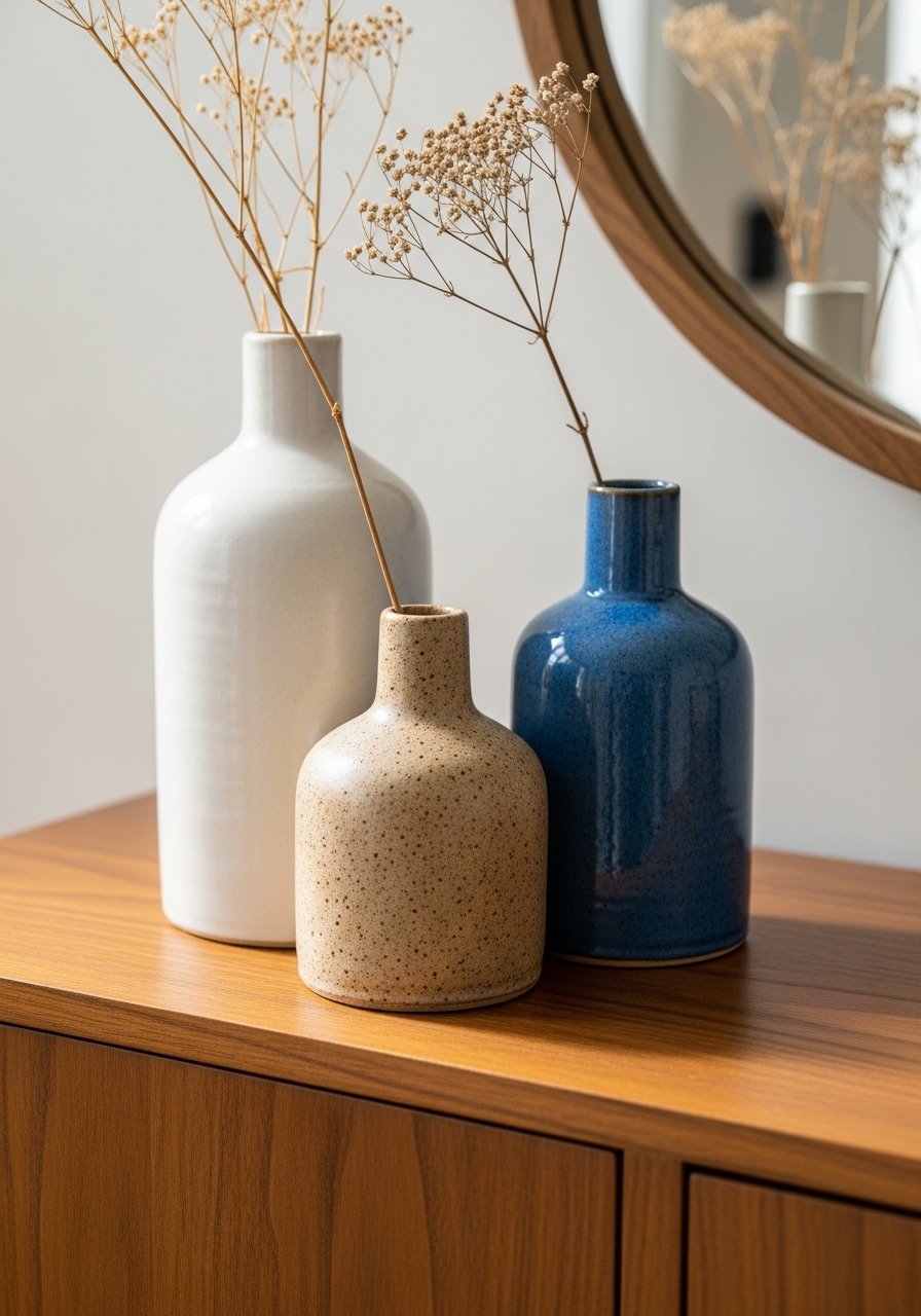 I grouped three handmade ceramic vases in three different heights to create an intentional first-impression moment. I used handmade ceramic vases in matte and glazed finishes; the contrast adds depth. The result feels tactile and collected. Avoid matching sizes or colors — that reads staged. Use dried stems or a single eucalyptus branch for low maintenance. This cluster makes the entry feel curated, not cluttered, and complements warm wood tones I’m seeing everywhere.