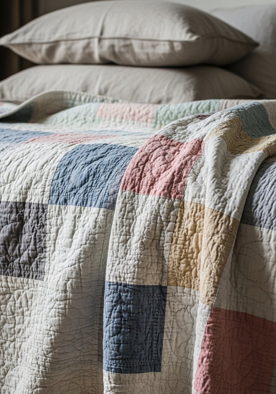 A hand-stitched quilt instantly adds history and softness. I layered a 72×90 inch patchwork quilt at the foot of the bed for color and warmth. I love hand-stitched quilts in muted blues and creams. The quilt reads like a family heirloom, even if bought recently. Common mistake: over-patterning the bed. Keep sheets and pillows simple so the quilt stands out. This makes the bedroom feel lived-in and inviting without feeling dated.