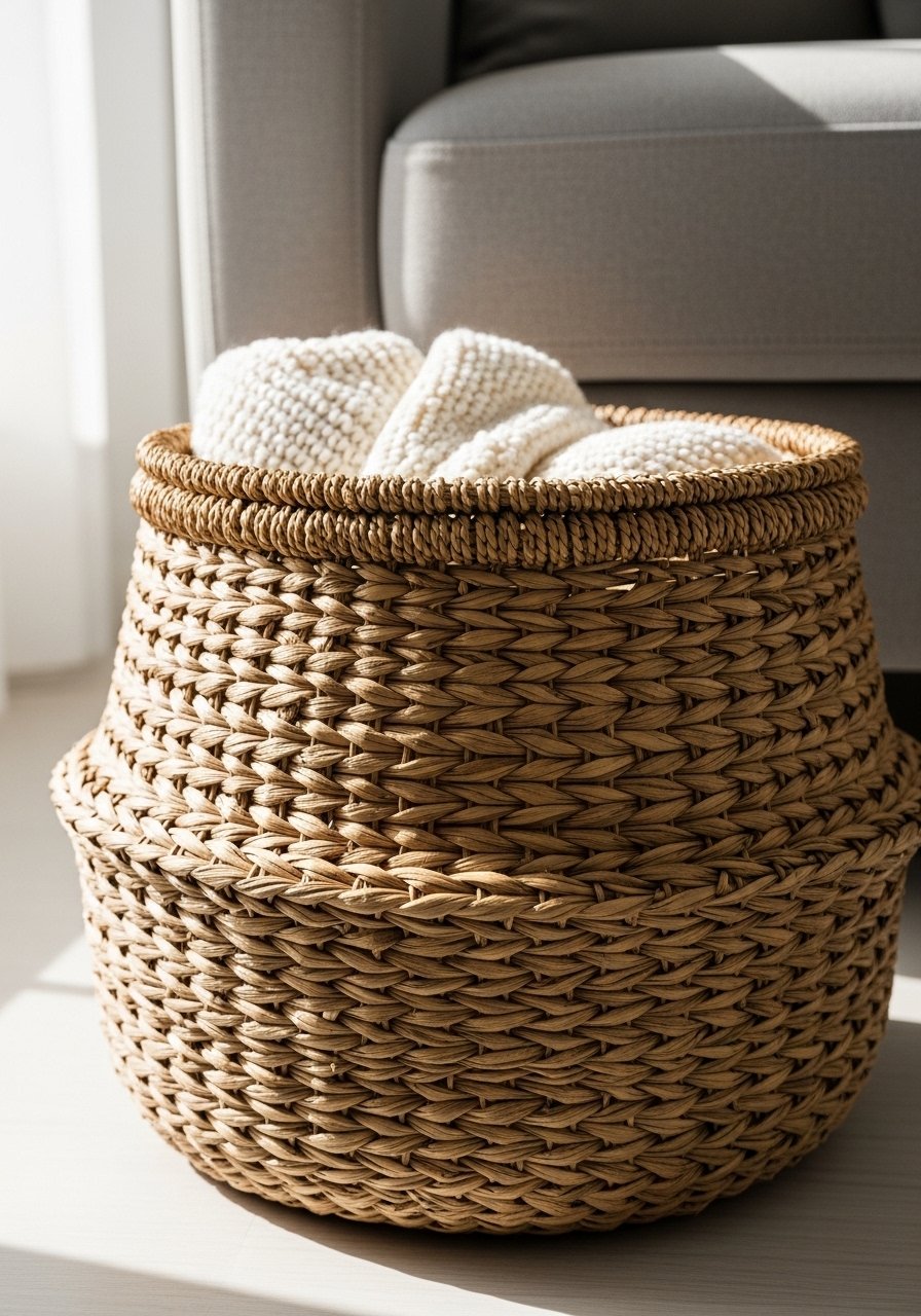 I use a large woven basket for throws and kid toys so storage doubles as decor. A 16×14 inch seagrass basket grounds the corner and adds natural texture. I picked handmade woven basket with leather handles for durability. Avoid tiny shallow baskets that look like clutter; choose pieces large enough to hold items neatly. This simple swap brings organic texture and keeps the room tidy while feeling cozy and intentional.