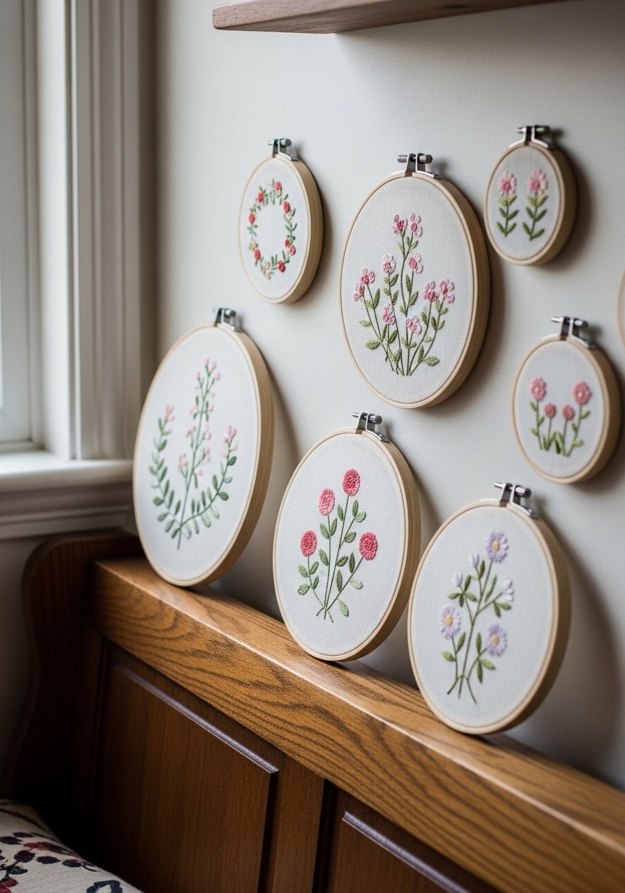 I created a mini gallery of embroidered hoops in varied sizes to add handcrafted interest to a narrow wall. I used embroidery hoop art sets in soft greens and terracotta. Odd-number groupings (3 or 5) feel intentional. Don’t mix too many styles — keep thread colors cohesive. This small change makes a breakfast nook feel personal and homey, and it's a fresh alternative to framed prints I often see.