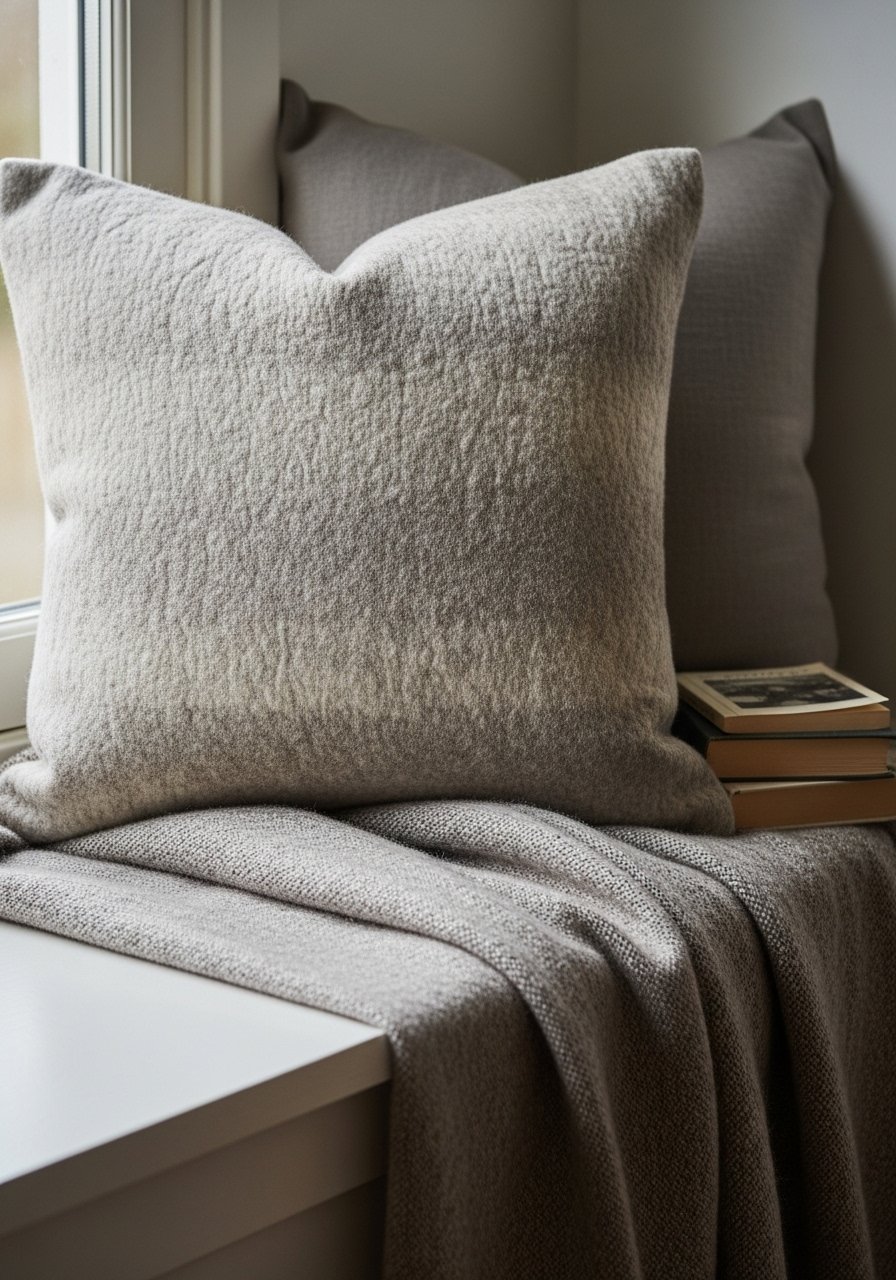 I swapped smooth cushions for a needlefelted wool pillow that reads cozy and sculptural. A 20×20 inch wool cover in oatmeal or rust is enough to change the feel. I use needlefelted wool pillow covers for texture contrast against linen. Avoid overstuffing; these covers look best soft and slightly slouched. This small tactile detail makes a reading nook feel like a place you actually want to linger in.