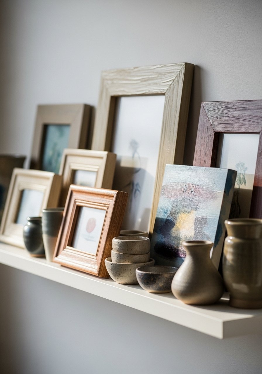 I painted small canvases and mixed them with photos and ceramics on a 24-inch floating shelf. Using small hand-painted canvases adds color without heavy commitment. Keep heights varied and items in odd numbers for balance. Mistake to avoid: overcrowding the shelf; leave breathing room. This approach keeps a narrow hallway from feeling empty and gives visitors a glimpse of your personality without drilling the whole wall.
