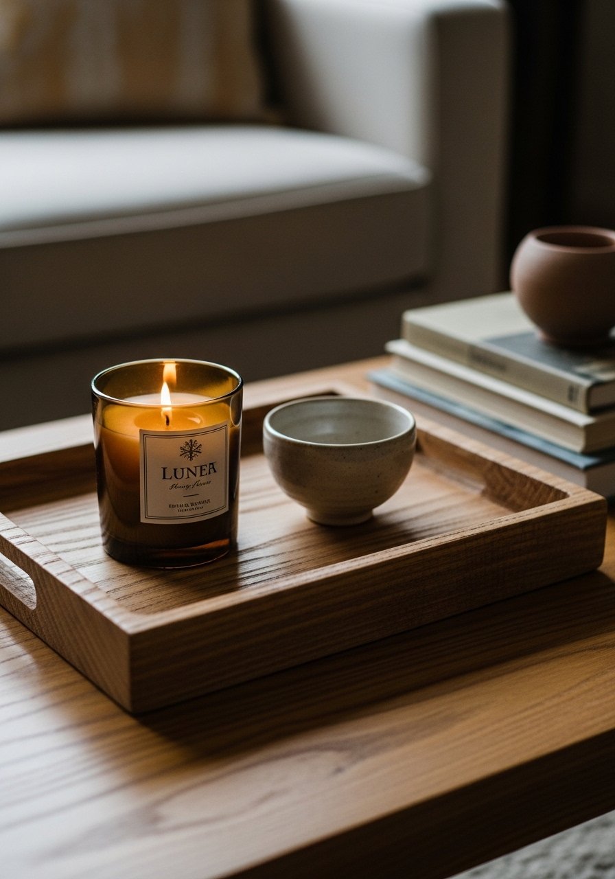 A hand-carved tray organizes the coffee table and gives structure to small objects. I chose a 16×10 inch tray with a carved lip to hold a candle, remotes, and a vase. I used hand-carved wood tray in white oak tones. Avoid tiny trays that disappear; pick one that reads from across the room. This makes everyday items look curated and keeps surfaces tidy while maintaining warmth and texture.