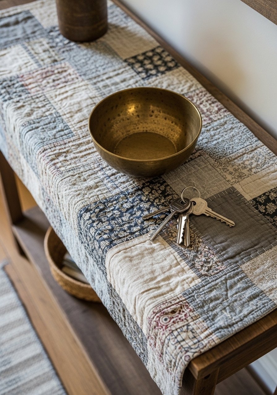 I sewed (or purchased) a small 14×48 inch patchwork runner using thrifted fabrics for color and pattern without commitment. A fabric patchwork runner in faded florals adds personality. Don’t use full-size tablecloth fabrics that overwhelm the space; scale down. This approach uses leftovers or thrift finds and gives the console an heirloom feel without spending much.