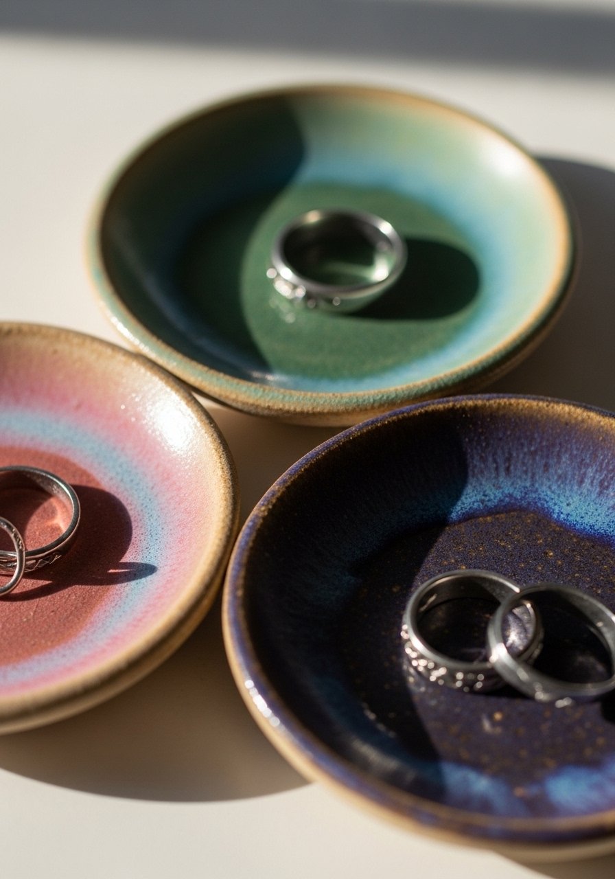 I keep three small clay dishes grouped on my dresser for rings, studs, and a watch. Each is about 3 inches across and glazed in complementary tones. I found handmade clay ring dishes that catch light and look delicate. Don’t mix metals or bright colors in this small grouping; keep finishes similar for calm. This tiny set makes daily routines smoother and adds a crafted detail to the bedroom surface.
