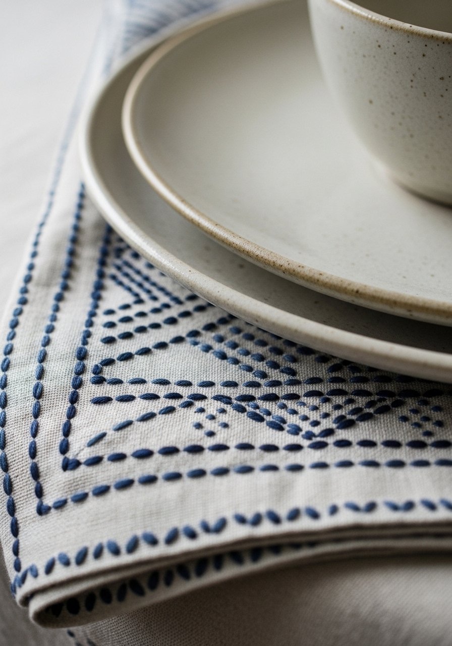 I swapped plain napkins for hand-stitched linen napkins with sashiko patterns. A set of four 18×18 inch napkins in natural linen adds subtle pattern and craft to the table. I bought sashiko linen napkins in indigo thread. Don’t pick tiny patterns that disappear under plates; go for visible contrast. This detail makes casual dinners feel considered and pairs well with simple ceramics and warm wood tables.