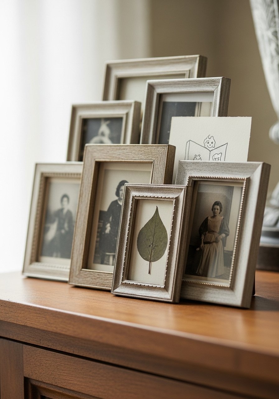 I layered thrifted mini frames (2×3 and 4×6) in a loose rectangle above my console to create a collected vignette. Mix a set of small picture frames with vintage black-and-white prints for contrast. Don’t over-symmetrize; slight offsets read more curated. This inexpensive technique gives an entryway a sense of history and warmth without committing to a full gallery wall.