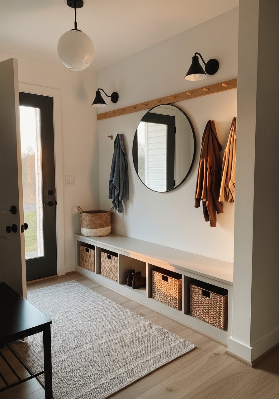 My entryway went from clutter to curated after I added a bench with storage baskets underneath. The bench height should be 17 to 18 inches for shoe removal comfort. Budget $100-400 depending on bespoke or ready-made. The cheap version is a shallow bench without storage. That becomes a drop zone for clutter. Pair with hooks and a small tray for keys. Try woven storage baskets.