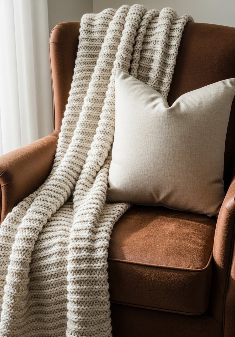 I built a cozy reading nook with a low leather chair, this cream chunky knit throw and a mix of linen and velvet pillows. Layering textures—wool, linen, leather—gives depth without clutter. I usually follow odd numbers (three pillows, one throw). Mistake to avoid: too many patterns at once. Keep one pattern, two solids. The result feels warm and relaxed, not busy, and it’s one of the easiest ways to add a Pinterest-ready corner.