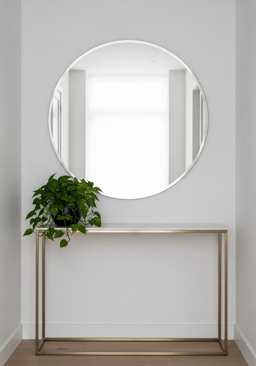 A single large round mirror opens tight hallways. I hung a 36-inch round mirror above my console and it doubled the light. Mirrors are the classic small-room trick; proportion matters—don’t pick a mirror smaller than half the console width. Avoid filling the console with too many low items; let the mirror be the hero. This makes any entry feel taller and more purposeful without major effort.