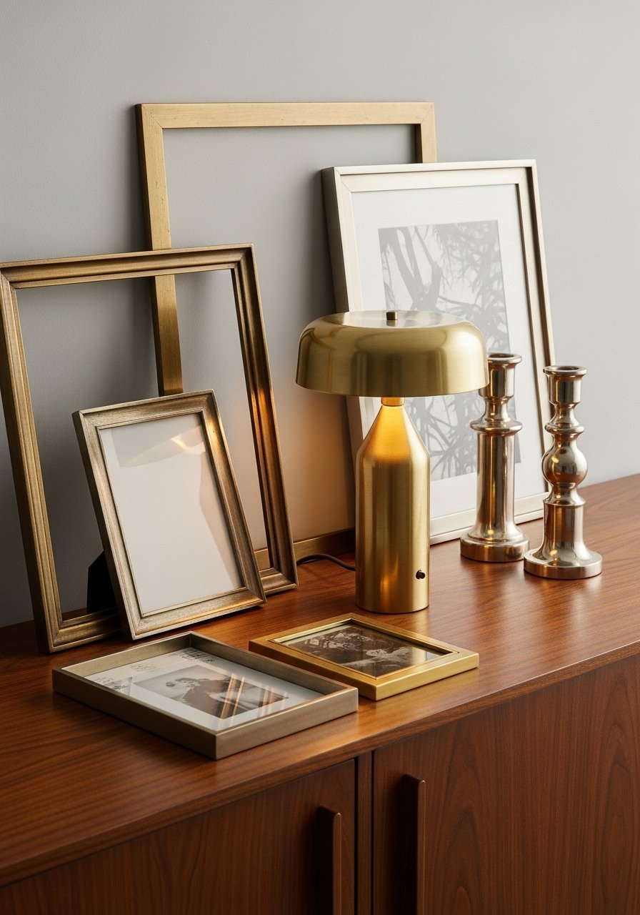 Mixing metals feels current — I paired a brass lamp with nickel frames and it read intentional, not chaotic. Use one dominant metal and one accent metal to avoid visual noise. I started with warm brass for fixtures and added cool steel in small accessories like mixed metal picture frames. Mistake to avoid: overloading surfaces with shiny pieces. Keep texture and matte finishes as balance.