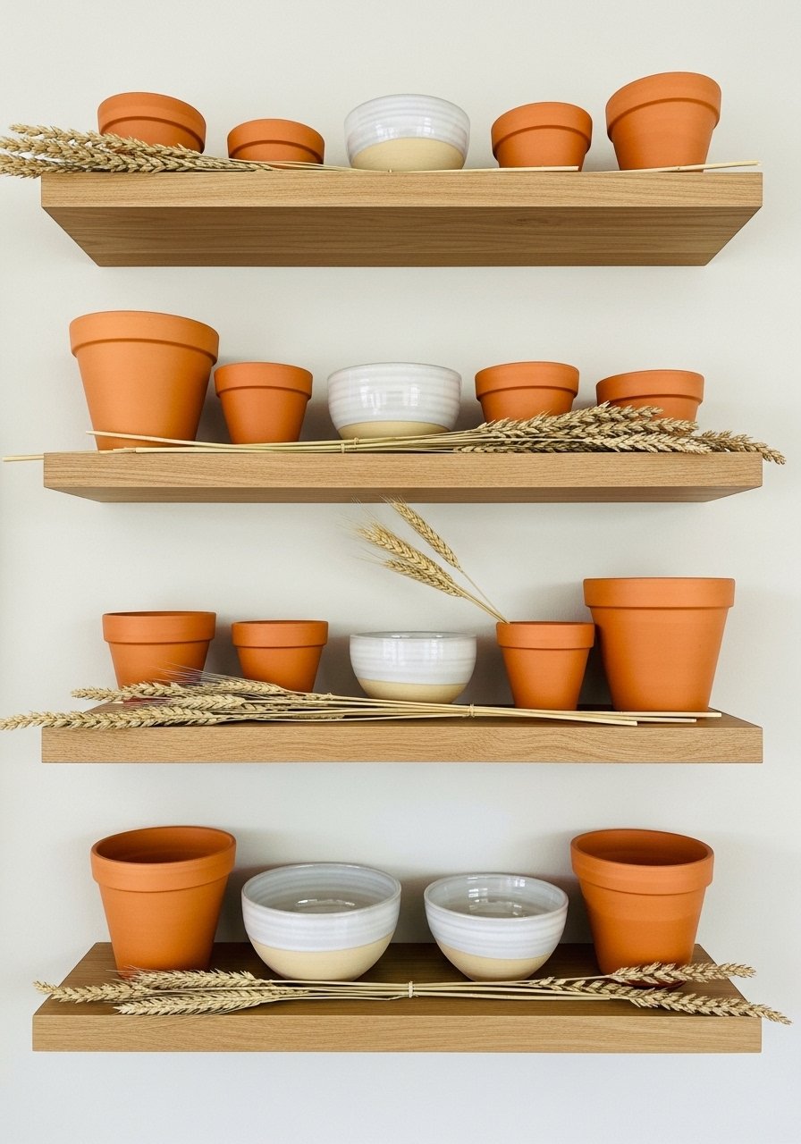 I swapped glossy ceramics for terracotta and clay to bring warmth and imperfection into my shelves. A small terra-cotta ceramic vase with dried stems anchors the display. These earthy pieces age well and photograph beautifully. Avoid lining up identical pieces; vary heights and finishes. The visual result is grounded and tactile — great for layering and combining with greenery or books.