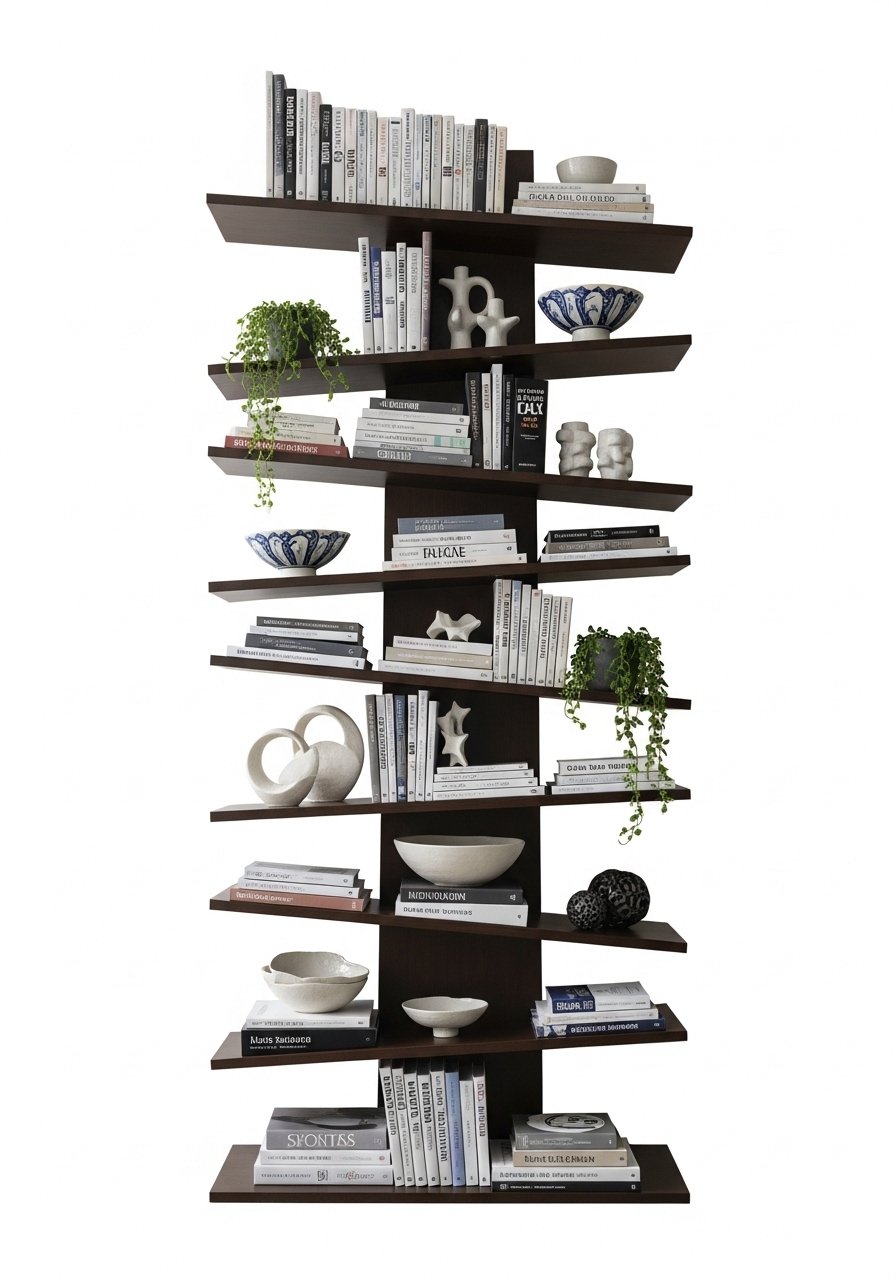 A sculptural bookshelf acts like art while holding things. I chose a staggered metal-and-wood unit and styled it with ceramics, books, and plants in groups of three. The key is balance—mix horizontal and vertical stacks and leave breathing room. I recommend a staggered bookshelf that anchors a tall wall. Mistake: cramming every shelf. Styling with intent makes storage look curated and not chaotic.