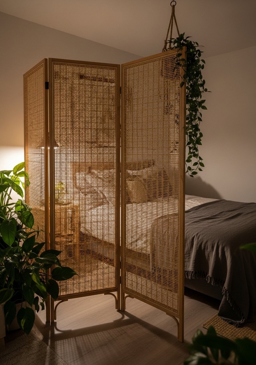 I use a folding rattan screen to create visual privacy in an open studio. It’s portable and decorative—better than a bulky divider. Place it behind the bed or desk to define zones. The mistake is using one that’s too tall or heavy for the space; choose a lightweight screen that complements your textiles. This is a simple, renter-friendly way to create separation and texture.