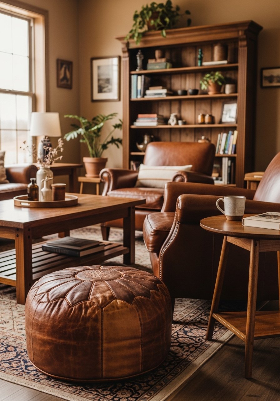 Leather adds warmth and ages beautifully. I added a cognac leather pouf and a slim leather chair to my office; they softened the room and introduced rich color without pattern. Use leather in small doses—pouf, chair, strap handles. Mistake: pairing shiny new leather with too many shiny surfaces—mix in matte woods and linens. The result is layered, tactile, and classic.