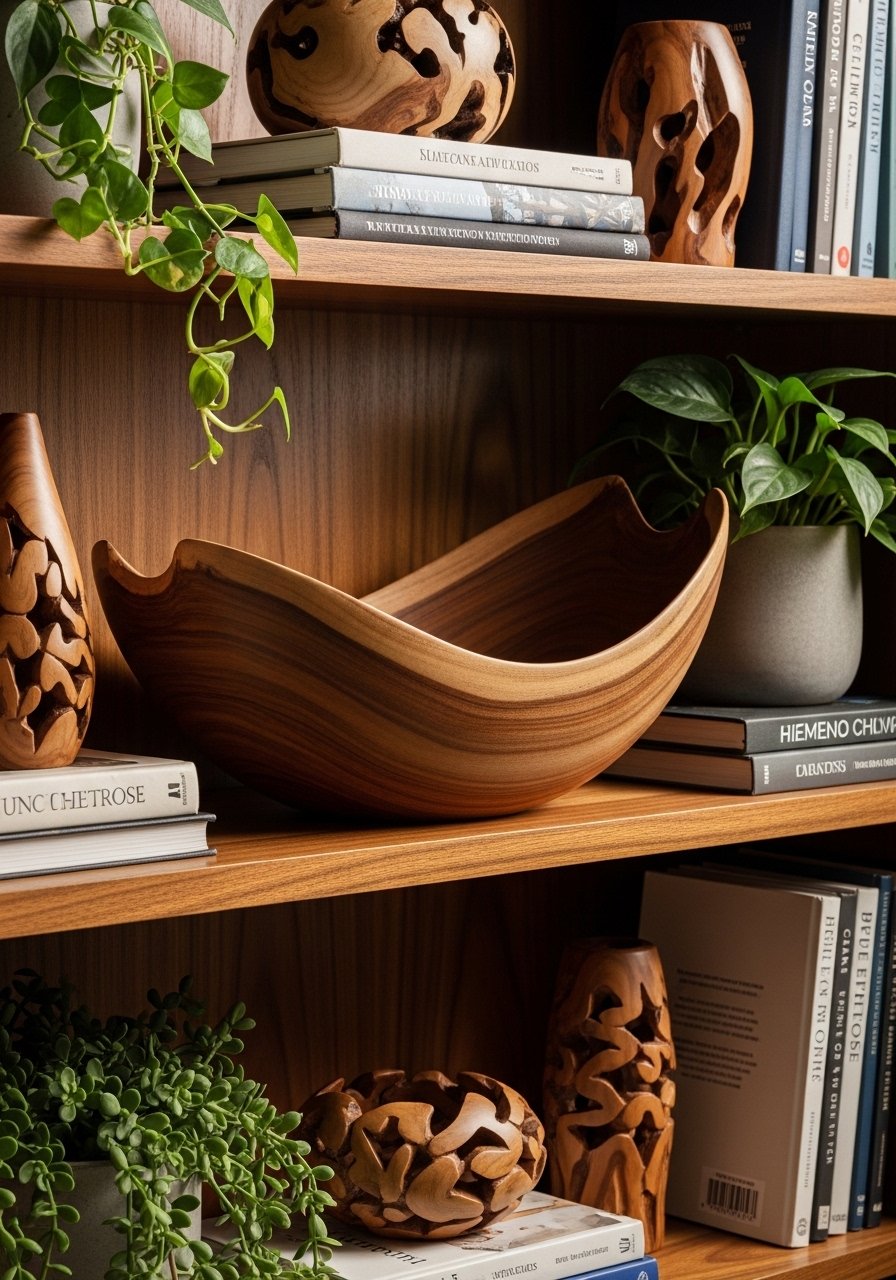 I added small sculpted wood objects—bowls, beads, carved figures—to my shelves for organic interest. They break up ceramics and books with warm grain and simple forms. These little items add personality without shouting. Avoid too many trinkets; choose pieces that read like art. Paired with plants and neutral ceramics, they give the space an edited, tactile quality that feels lived-in and calm.