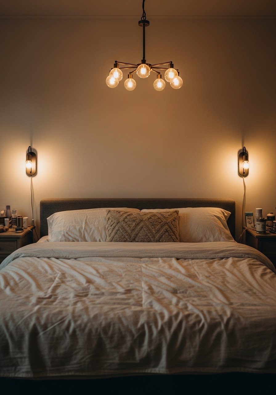 I usually swap the overhead fixture for a simple black pendant or a budget chandelier. Then I add plug-in candle-style sconces for a soft, layered glow. The chandelier gives the room a focus; the sconces give it warmth.