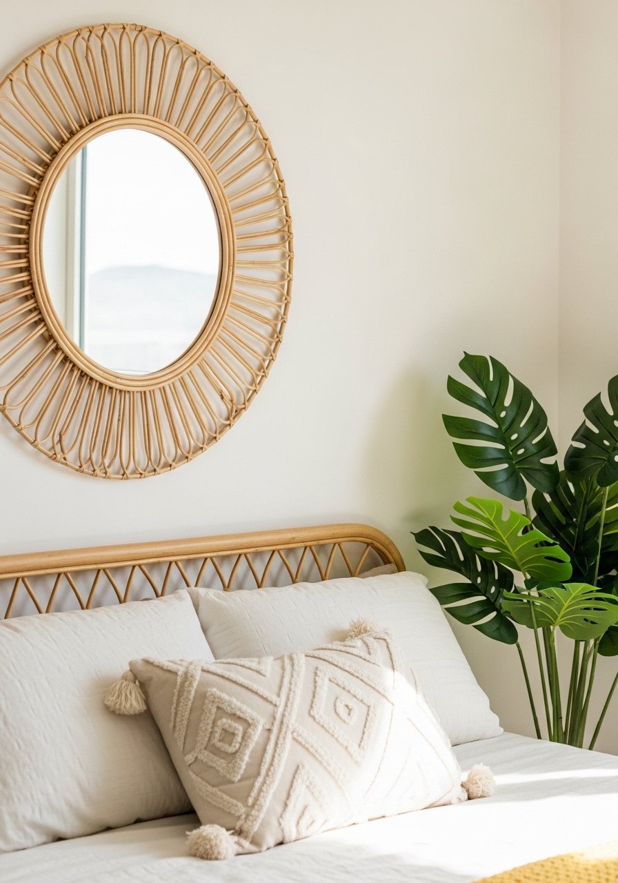I hang a round rattan mirror where it will bounce light back into the room — above the bed or opposite a window. I tuck a faux monstera into a corner for height and shape. This visually expands the space and adds life without fuss.