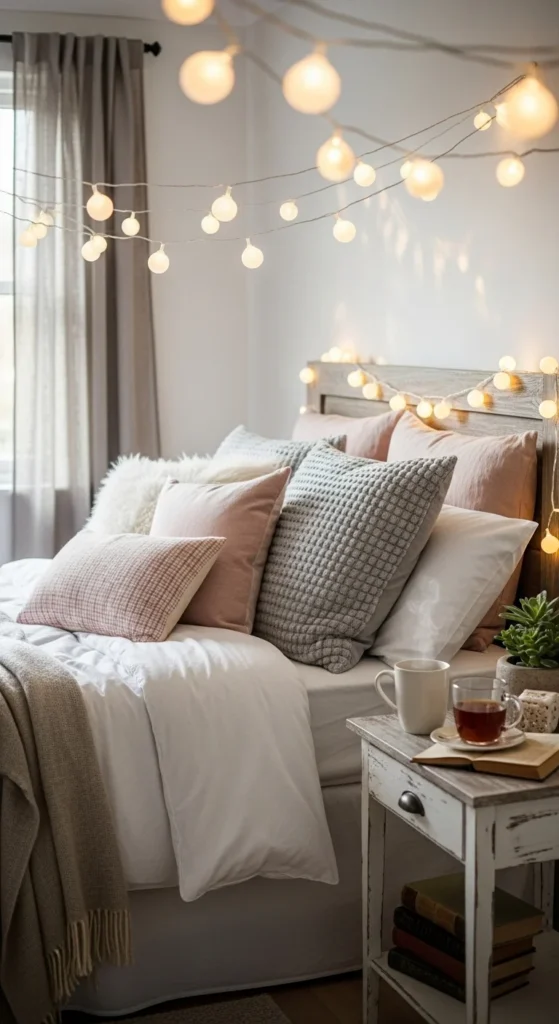 Beds are the natural centerpiece of most rooms. Adding fairy lights here gives you maximum visual payoff for minimal effort.
