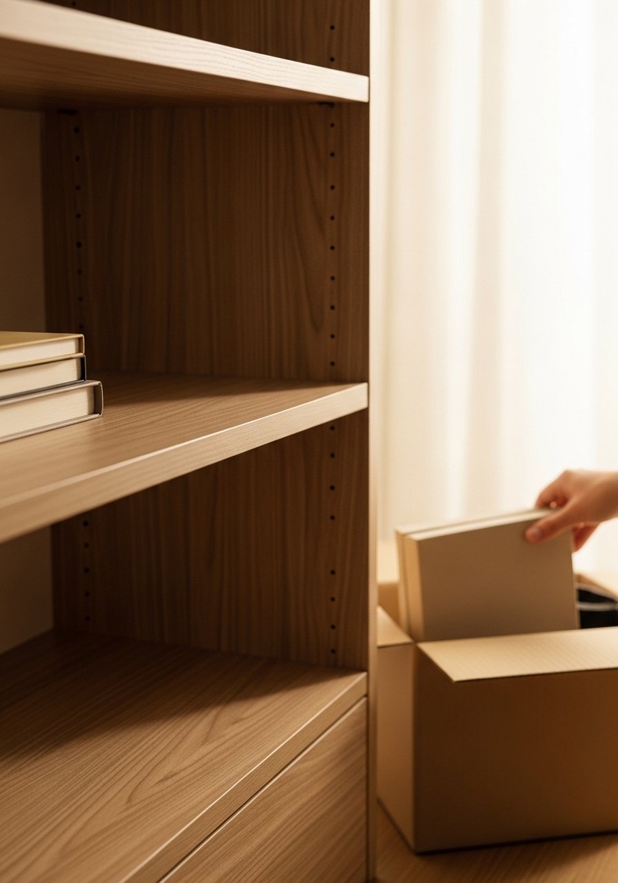 Arrange items into three piles: tall, medium, and low. Each shelf should have 2 to 4 visual anchors, not ten. That reduction creates negative space and breathing room.