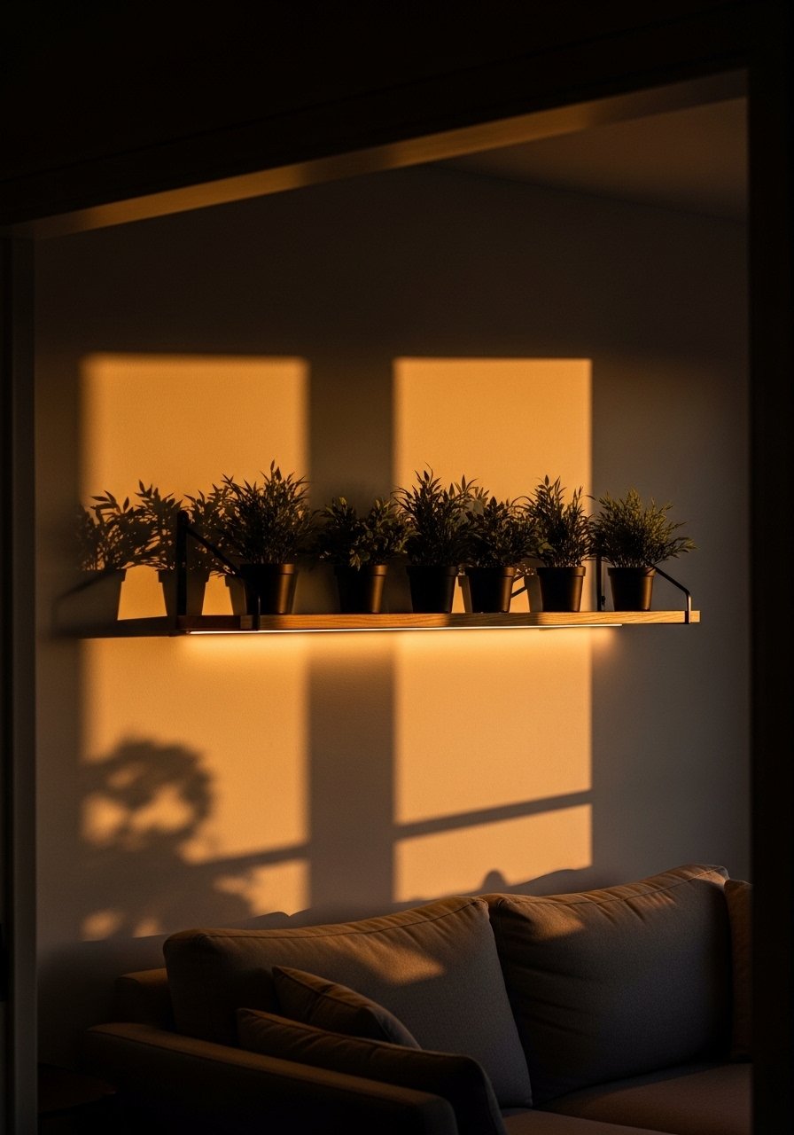 Greenery makes shelves feel lived-in instantly. Place a small trailing plant on a higher shelf so it can visually connect levels. Add a warm LED strip behind the underside of a shelf to create depth at night.
