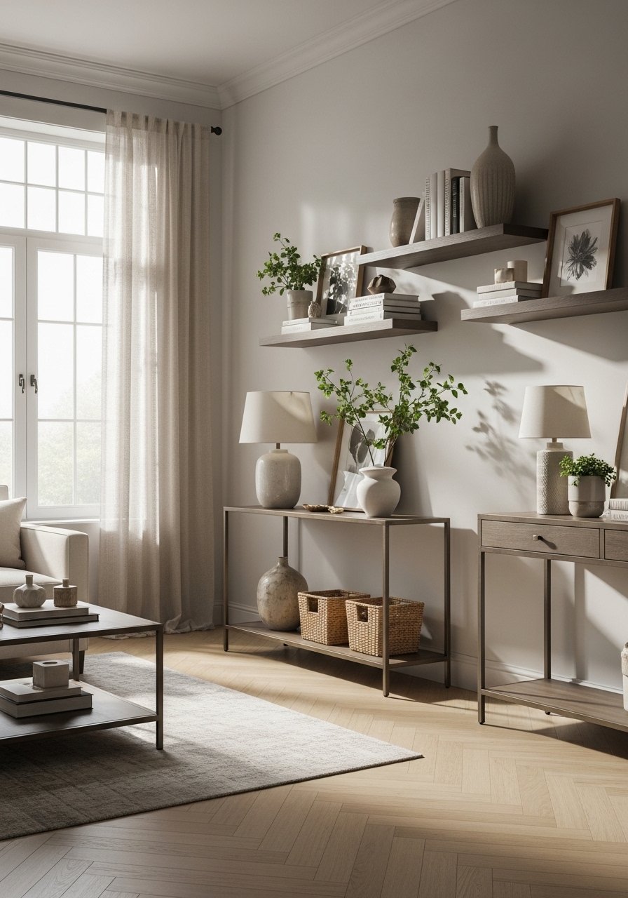 Pick one corner and style a single shelf. That small win changes how the room feels and gives you confidence to keep going. Start with one repeated material and one living plant.