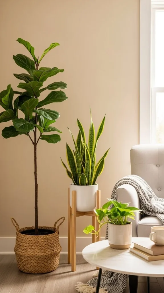 Vertical plants naturally draw the eye upward, making the room feel taller and more open.