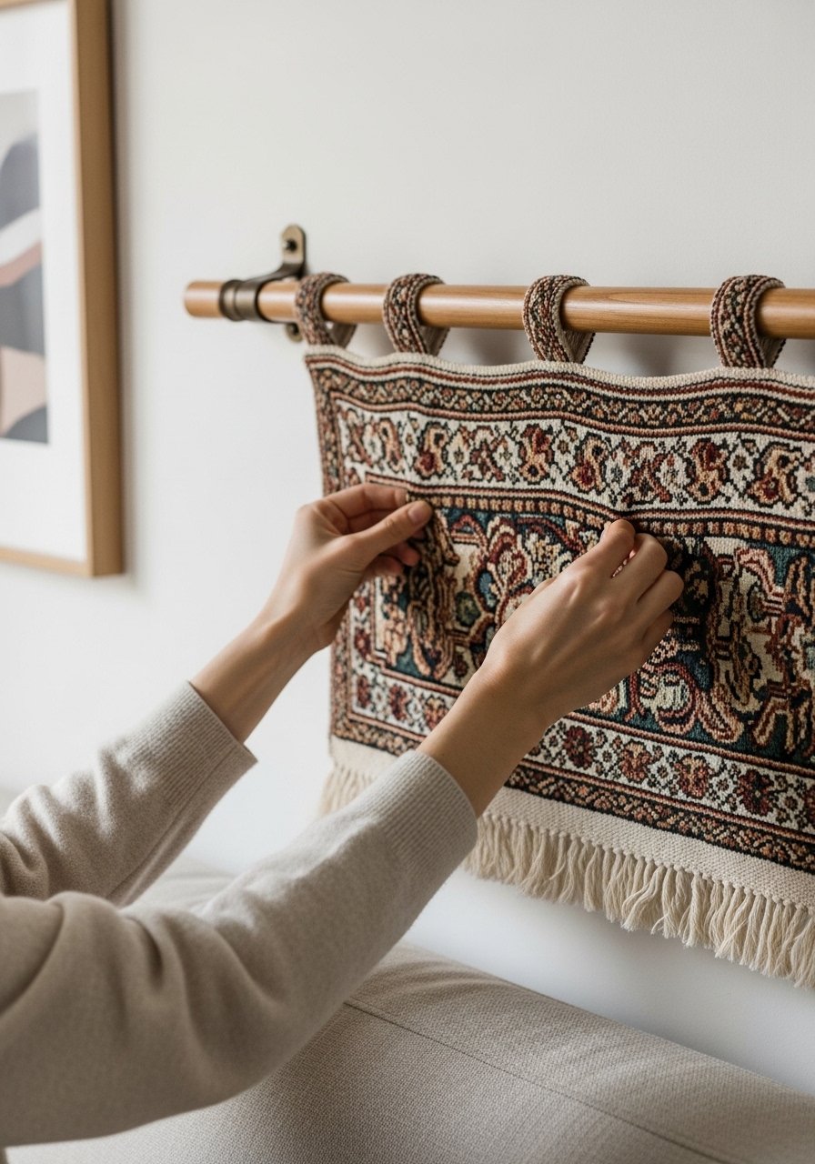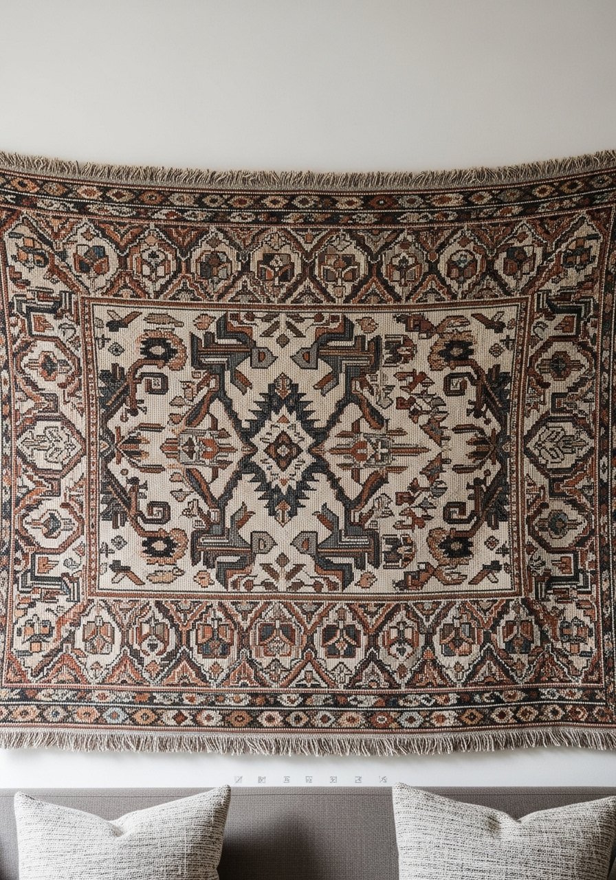 I treat the tapestry like a fabric picture frame. It should anchor the furniture, not float above it. I hang mine low enough to feel connected to the sofa or bed, but with breathing room so the top of the piece doesn’t feel cramped. One insight I use: it’s better to tilt or offset a tapestry slightly than force it exactly centered — it creates a relaxed, intentional look. The common mistake is hanging it too high so it reads disconnected from the room’s focal point.