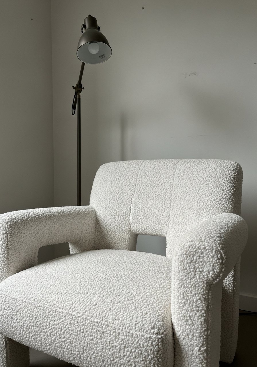 - Bouclé accent chair, cream, mid-century style (~$250–500)