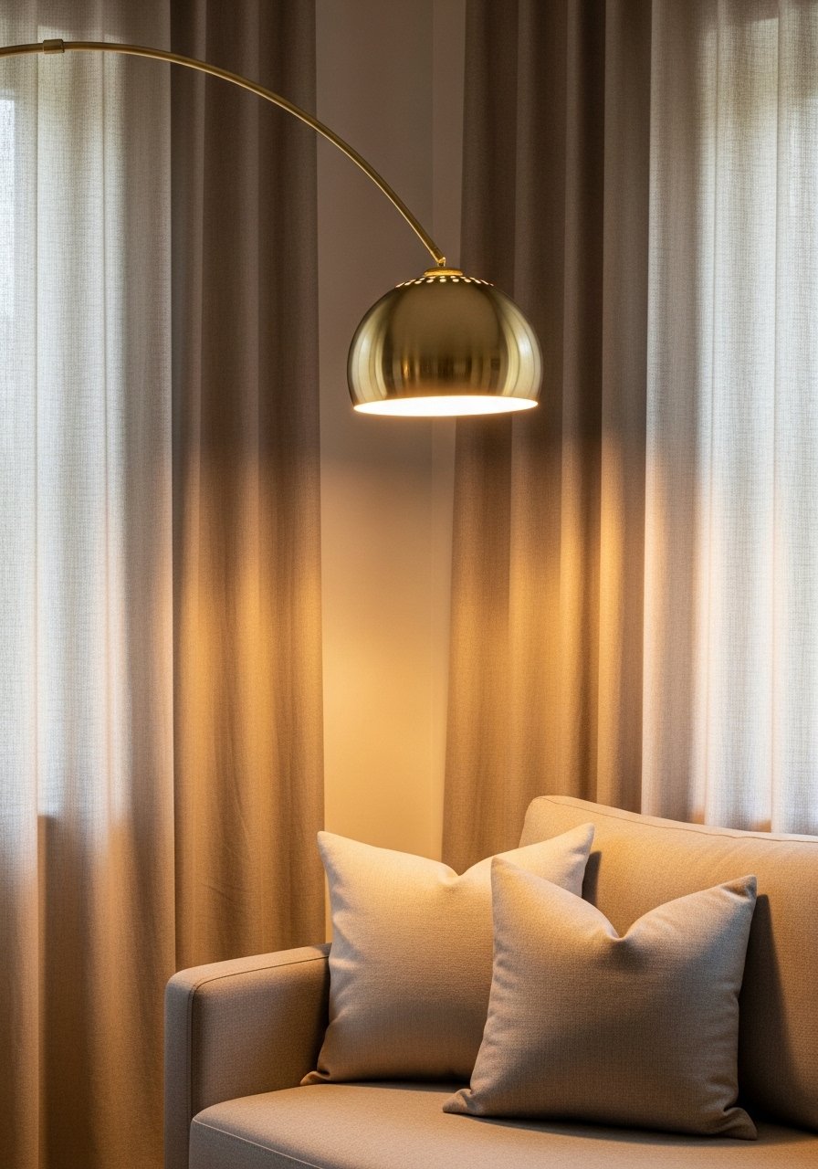 I hang curtains high and wide so the window feels larger and the wall gains vertical rhythm. Then I add a warm floor lamp near seating to create pockets of light. Together they give the wall a purpose without new color.