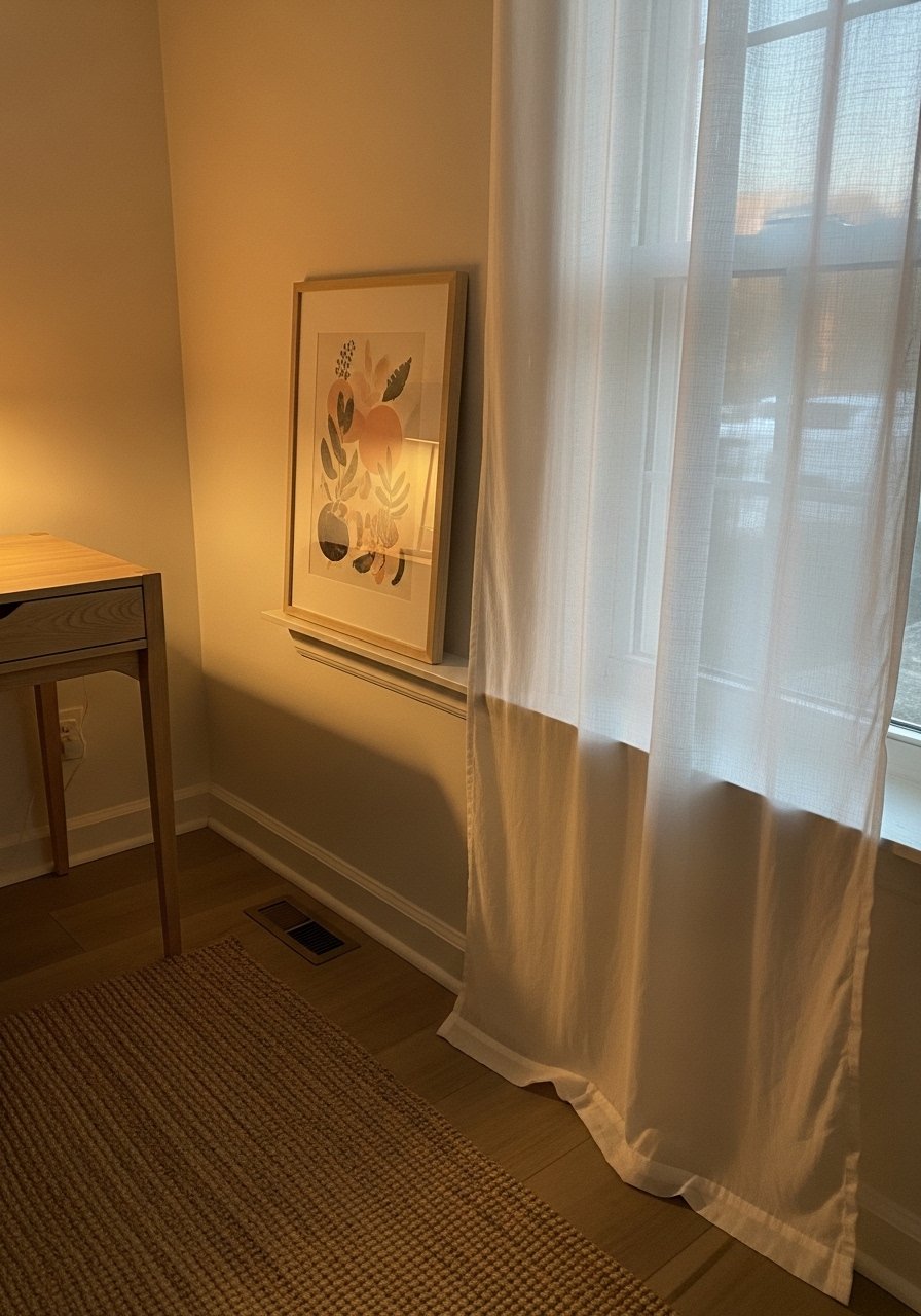 A rug fixes where the work zone sits in the room. I choose a rug that the chair can rest on. In small rooms that means a 6×9 rug. In larger rooms I go 8×10. Add curtains in a light linen for vertical softness. Place one larger piece of art on a ledge instead of many tiny prints.