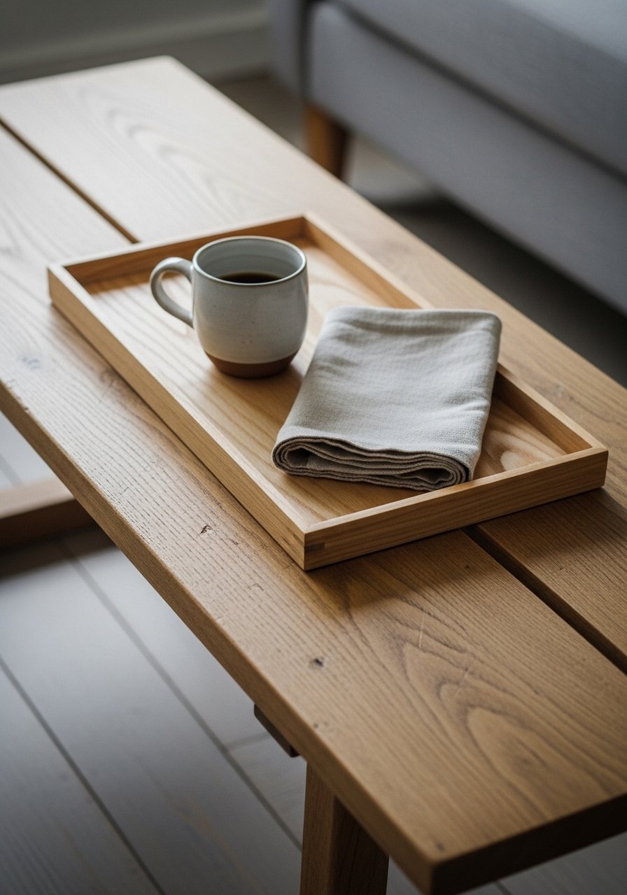 Top with a small wood tray, one ceramic, and a stack of thin books. Keep it low and functional; it should encourage relaxed posture.
